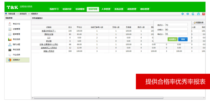 系统可以通过用户组,部门,班级等多种分类统计学员成绩,更能统计合格率、优秀率、总分、平均分等数据。